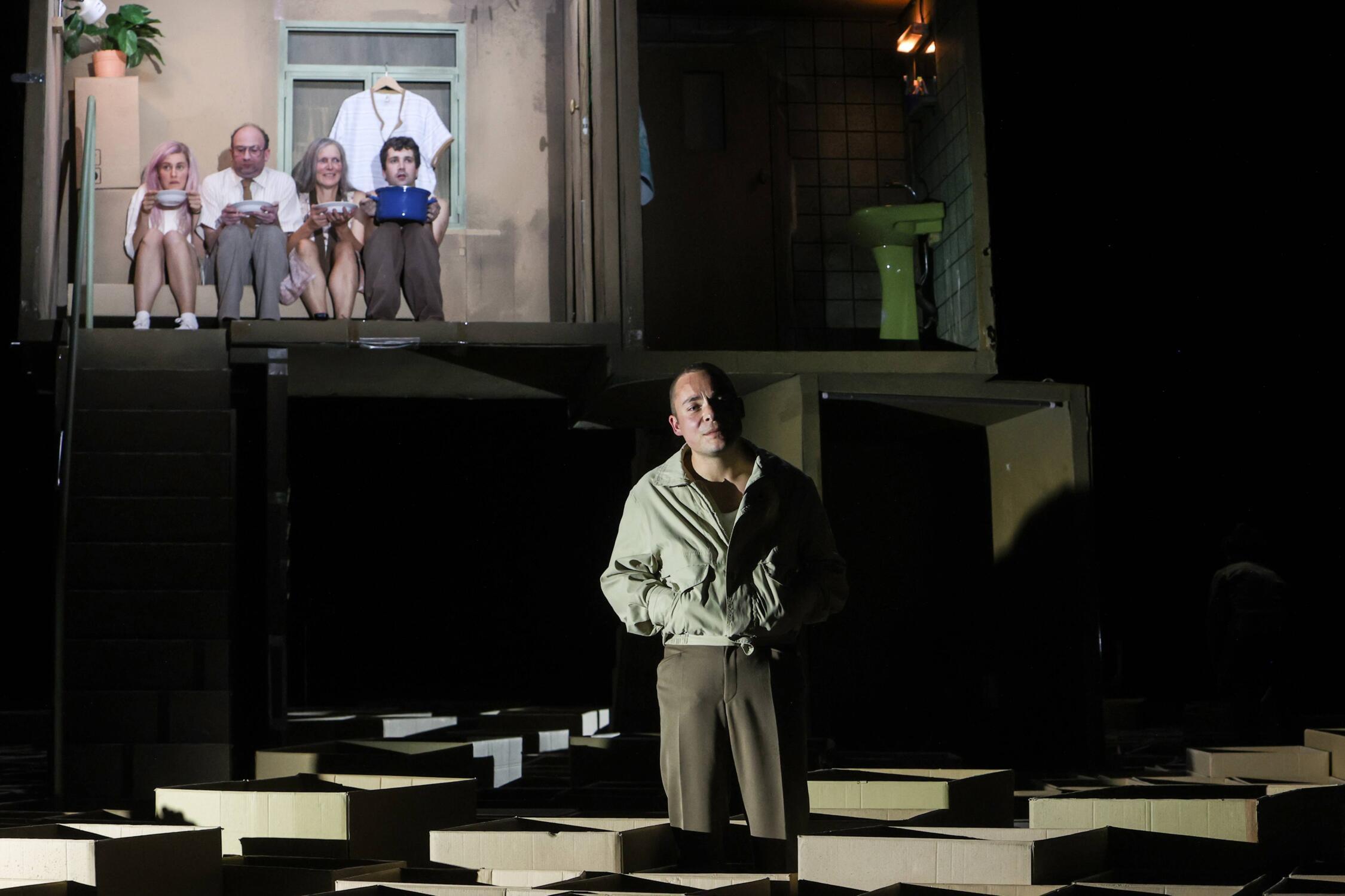The Osnabrück production emphasized the loneliness of the characters, whether they are seen with partners, have got partners according to what we are told, or are explicitly lonely. Frau Yamamoto was played by 80-year-old Angelika Thomas, who launched her impressive stage and screen career as an actress at the theatre in Osnabrück, with the other characters cast from within the resident company. Marleen Johow’s set focused on the revolve, which turned a lot, to show the passing of time, or to allow shifting of perspectives. Individual units of living spaces were stacked above each other, in desolate container fashion, with metal stairs leading from the ground to the higher levels. The characters lived their isolated, empty, pathetic lives in this relentless environment, with, and due to, a severely restricted ability to communicate with others or even with themselves. Only Frau Yamamoto was different, in her matter-of fact cheerfulness in view of, and despite, loneliness, at least with lively memories of some events in her life, and with the courage to leave her door open to allow for random communication with the strangers living in the same building.