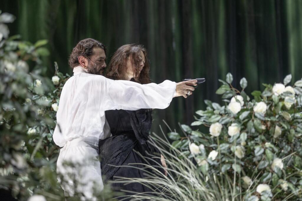 The set and Richard’s appearance reflect director Antonio Latella’s concept of evil, which resides, “in beauty, not in disharmony. Evil is the garden of Eden.” (a program note) Far from more traditional interpretations of the protagonist, as a dark, disabled Machiavel, Latella’s conception comes close to recent interpretations of the King, such as Jonjo O’Neill’s Richard at the Royal Shakespeare Company during the World Shakespeare Festival in 2018, or the 2024 award-winning production at Belfast’s Lyric Theatre, starring an, at times, clownish Michael Patrick.