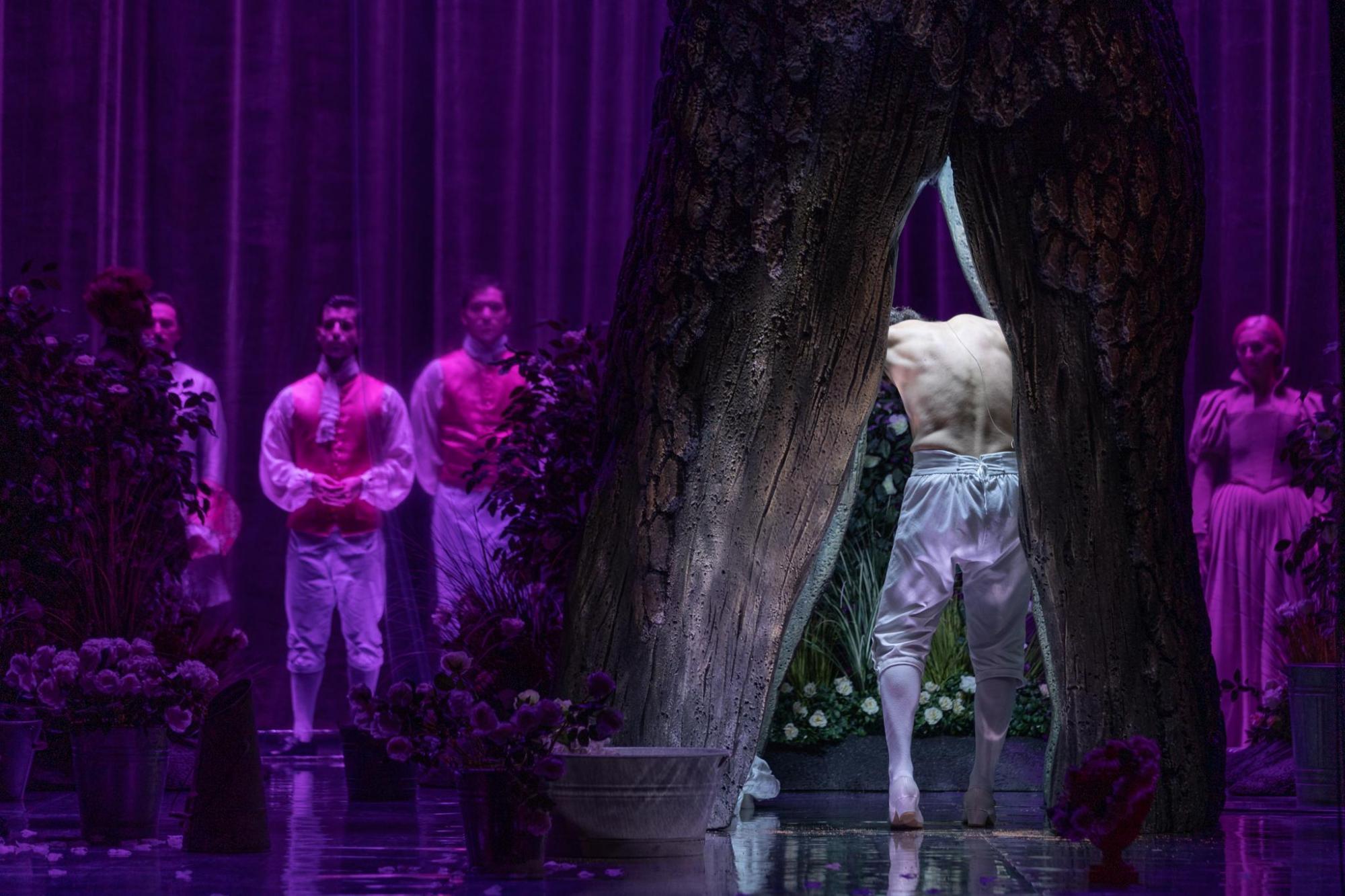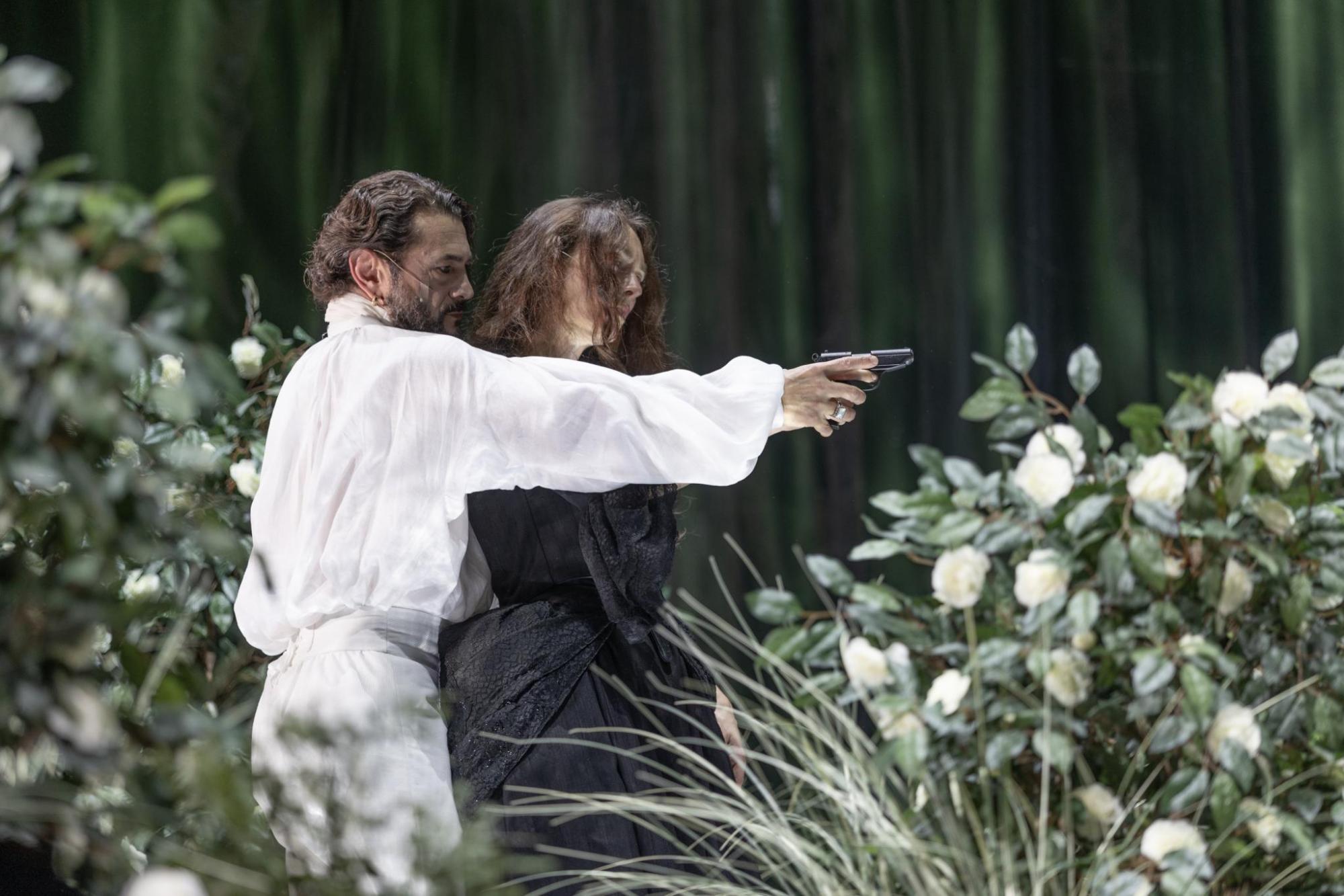 The set and Richard’s appearance reflect director Antonio Latella’s concept of evil, which resides, “in beauty, not in disharmony. Evil is the garden of Eden.” (a program note) Far from more traditional interpretations of the protagonist, as a dark, disabled Machiavel, Latella’s conception comes close to recent interpretations of the King, such as Jonjo O’Neill’s Richard at the Royal Shakespeare Company during the World Shakespeare Festival in 2018, or the 2024 award-winning production at Belfast’s Lyric Theatre, starring an, at times, clownish Michael Patrick.