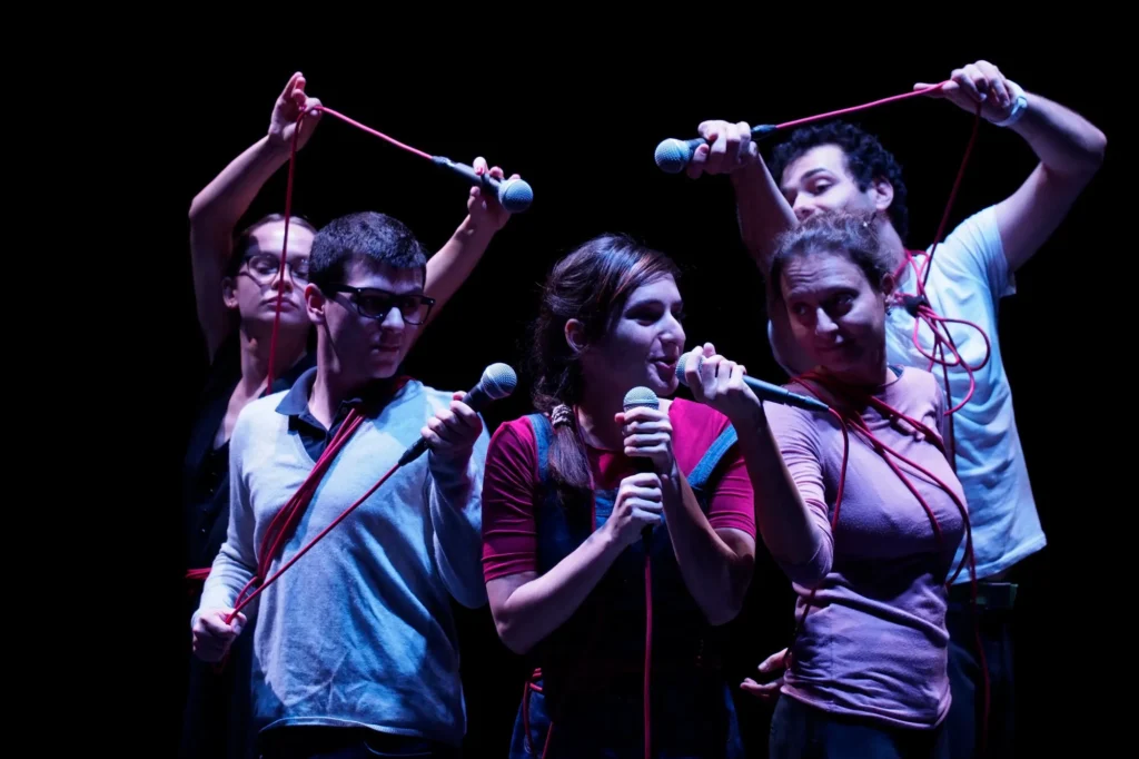 Although my attendance at the festival was cut short by personal schedule-related matters, I could not help but try to watch the immediately sold-out Acrobații – 7 zile din viața unor profesori de țară [EN: Acrobatics – 7 Days in the Life of Rural Teachers]. Written and directed by David Schwartz, an already iconic figure of Romanian political theatre, it follows the interconnected storylines of five teachers from Poiana, a locality with a name so common, it cannot be pinned to a specific region of the country. From ideatic clashes concerning the actual meaning of the act of teaching, to power struggles within the politically-ridden local and central educational institutions, and from personal issues interfering with work ethics to the white lies that, unfortunately, are needed to keep the system running and the kids (more or less) in school, the acrobats do not abstain from honest, sharp remarks on the problems that de-center the children in the teaching process, and also ask painful still rhetorical questions, such as the “What can be done?” written on the blackboard at the end of the performance. The dynamic cast (David Drugaru, Anamaria Feraru, Silvana Mihai, Katia Pascariu, Octavian Voina) switches between teachers, parents, politicians – and other adults adjacent to the system -, and pupils, singing, dancing, and taking the audience along by even integrating them directly into the action. They even take the phone of one of the spectators who was “misbehaving in class” and only return it after the curtain call, hence creating the more intimate feeling of a class of people who actually know each other enjoying recess. In spite of Acrobatics having the artistic strength and the team’s creative authority (including Katia Pascariu’s recent win at the Locarno Film Festival) to pierce beyond the “bubble”, it faces the same systemic issues Romanian political theatre has been facing for decades – it only addresses the people who already know and already care about the topics depicted on stage, rarely reaching audiences to whose status quo it could pose a threat, thus only deepening the societal chasm.