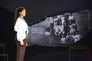 Josefina (Manuela Velasco) in dialogue with history in Historia de una maestra (Story of a Teacher). Photo: Geraldine Leloutre, Centro Dramático Nacional