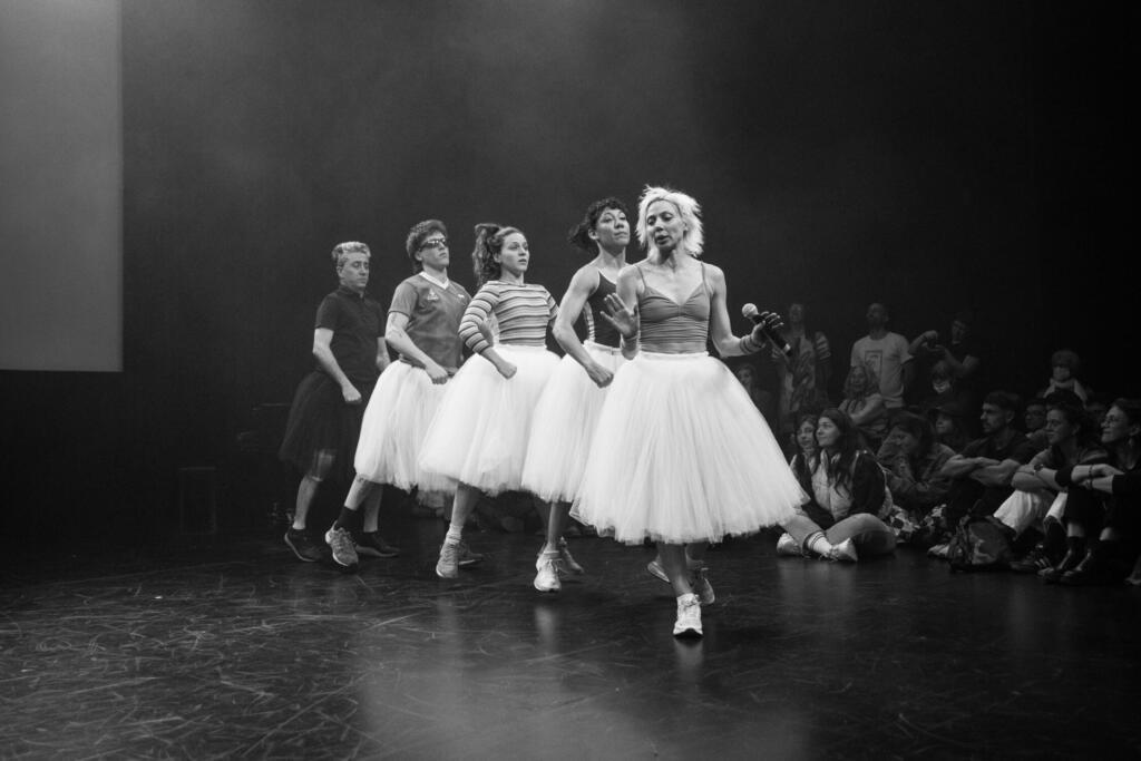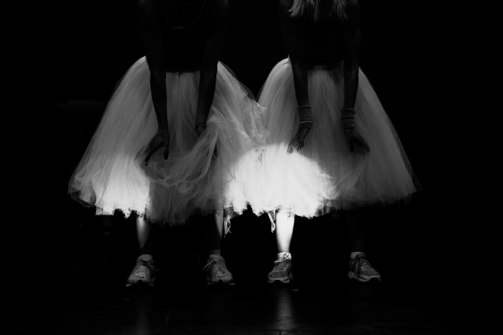 Julián Cabrera, dressed in a black tutu as an agent of death, narrates that 385 theatres burned between 1801 and 1877. Dancers catching fire was seen as less important as theatres going up in flames. Centring the body as the site of conflict, Acuña and Carla Di Grazia spin around the space, in white tutus, trainers and trainers. They swerve and run, they spin and swirl. Collisions are only just avoided as the bodies — the sites of carnage and flames for the dancers in the tales narrated by the performers (Acuña and Di Grazia are joined by Tatiana Saphir, Cabrera and percussionist Agustín Fortuny on stage. The latter, in tutu and football shirt, mixes the soundtrack; predominantly techno-punk that pulsates through the space. At times there is music, at times distorted voices, at times he plays the piano or drums, at times he dances: movement comes through the different sound registers and in his shifts through varied musical forms and genres. The classical is just one of the many sonic languages of the piece. The screen projects a short film made by Moguillansky: flickering images of dancers engulfed by flames. Degas’s dancers intersect with sepia photographs. The images are poetic rather than literal: a collage of consumption and disappearance, of dancers at the mercy of a system of illumination over which they had no control.