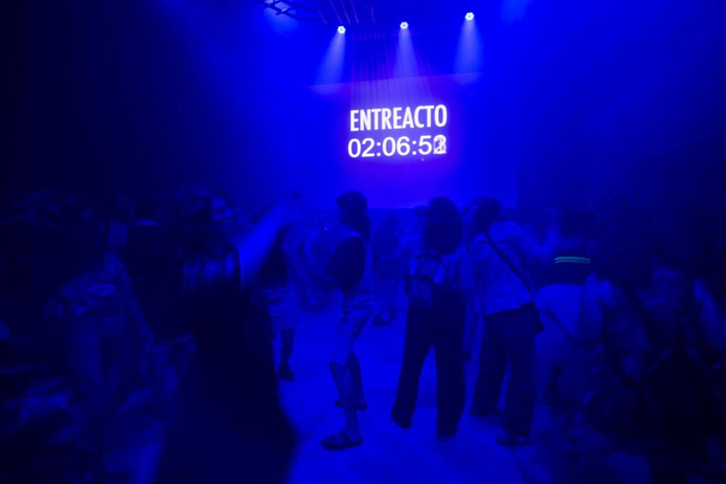 “Esto no es una obra” (This is not a show). “Es una fiesta” (it’s a party) appears on the screen to contextualise what is to come as a prologue. Only this is contradicted almost immediately with “En realidad, si es una obra” (In fact, it is a show). Bailarinas incendiadas refuses to fix what it is: a play but not a play; a party but not a party; a historical play but also resolutely contemporary; participatory but not karaoke; the audience can dance if they want to, but don’t have to. We have a huge degree of freedom as audience members to wander where we want to. We are invited to make of the performance what we will.