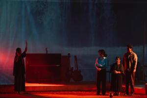KIMVNTeatro’s newest piece Ütruf Tripay, presented at UC Teatro and written and directed by Paula González Seguel, explores the illegal adoptions of indigenous infants during Pinochet’s dictatorship. Researched over five years, it is a dream-like piece drawing on the testimony of those who were displaced from their families in a state-endorsed system of adoption which ran between 1973 and 1990. Ütruf Tripay draws on five years of research on stolen Mapuche children with some terrifying statistics: 39,000 children are still to be reunited with their biological families; mothers were told their children had died; children were exported across Europe as well as in Chile. The tales of three key witness structure the piece: Alejandro Quezada who fronts an organisation that tries to reunite displaced children with their families; Alina Namuncura, who was adopted in Germany, and Jeannette Velázquez, a member of Sons and Mothers of Silence, an organisation that campaigns for justice for these children. The piece is haunting: a series of episodes where voices calling out from behind a glass door; moments of reflection from the lone Alejandro as he searches for a family that he may never find; haunting piano melodies that evoke a past that remains unknowable. Andrea Contreras proffers a scenography of loss and displacement as the cast of seven wander across the stage absent and adrift. The piece has something of a courtroom feel also with Jeanette’s legal discourse addressing the audience as a jury. Multiple dramatic registers come in to play in a production that refuses to see ‘reality’ as a single theatrical idiom.