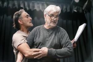 Uruguayan dramatist Gabriel Calderón frequently directs his own plays, Here Chilean director Cristián Plana stages Calderón’s Historia de un jabalí o Algo de Ricardo/Story of a Boar or Something about Richard which has been revised from its original 2020 single performer version to incorporate a second role. Here the actor who feels his time has come to take on a leading character after a lifetime in supporting roles is joined by his director. But increasingly, there is conflict in the rehearsal room as they prepare a production of Shakespeare’s Richard III. The busy rehearsal room is conjured through a circle of chairs, a rack of costumes and a table with refreshments for the cast. Actors and characters are referred to by name as the duo argue out the politics of the play. Marcelo Alonso’s director is cerebral and thoughtful; he’s done his research on the houses of York and Lancaster and the broader historical context for the play. Francisco Reyes’s actor just wants to be the centre of the production; he’s planning a showy performance and pays no attention to what might be ethical or appropriate.