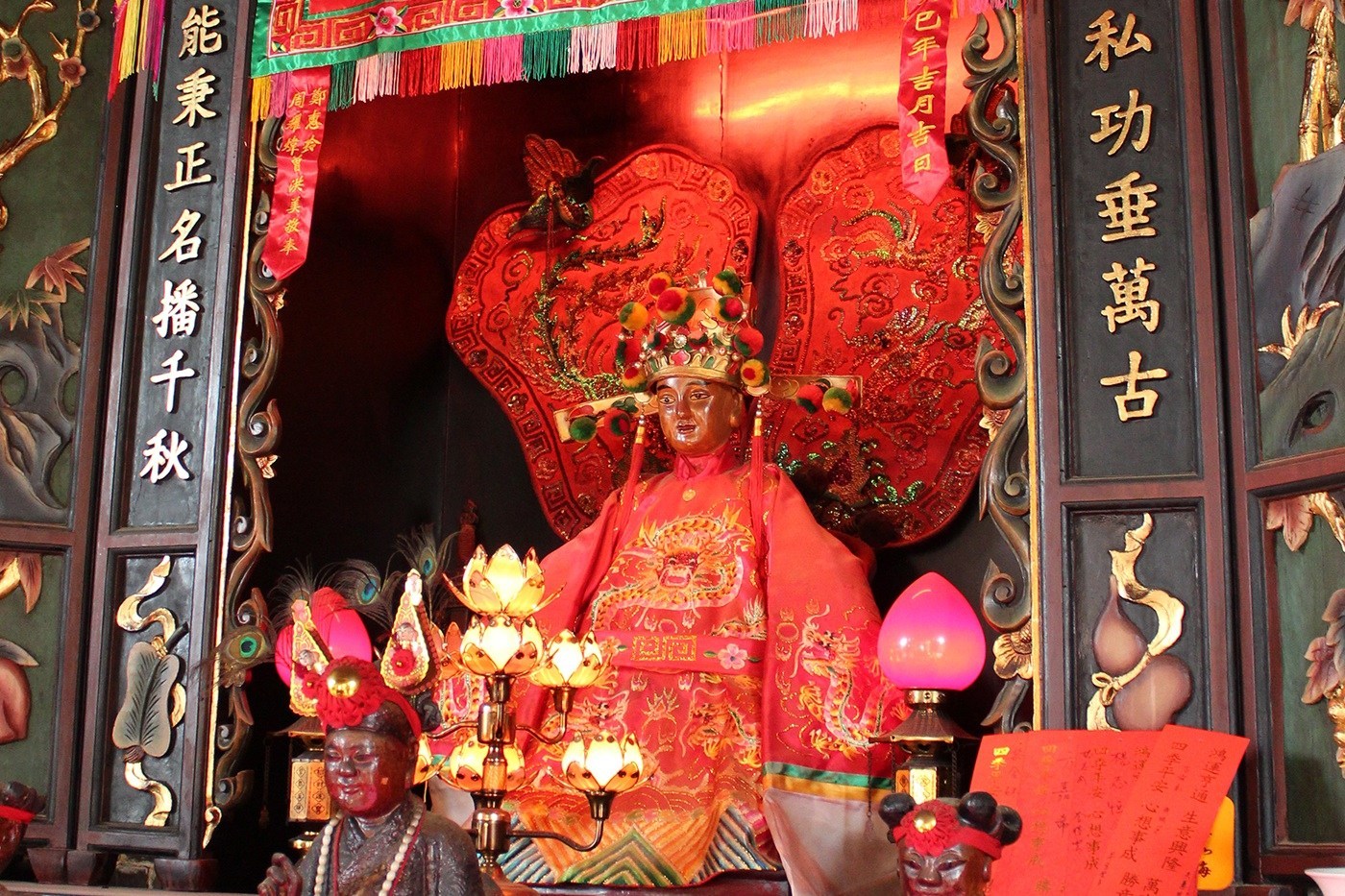 Tam Kung, also known as Tam the Great Immortal (Taam4 Daai6 Sin1 譚大仙) is a youthful sea deity who is particularly popular in Hong Kong and Macau. There are a few accounts of his origins, but the story that has been traditionally told is that Tam Kung was a native of Huizhou in Guangdong and lived at some point during the Yuan Dynasty (1271-1368). At the age of 12, he attained the Tao and was able to cure the sick. The Taoist immortal kept his youthful appearance despite living into old age and was said to be frequently seen wandering around Nine Dragon Peak (Gau2 Lung4 Saan1 九龍山) in Huizhou with a tiger carrying his belongings. When terrible storms occurred, he would throw a cup of peas in the air and the weather would become calm. When rains were needed to prevent fire or water crops, he would throw a cup of water into the sky, calling forth torrents.