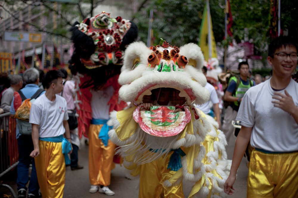 The banging and crashing of drums, gongs, and cymbals pierce the air and rings through the ears of the festival goers. The raucous fanfare announces the coming of the parade that steadily snakes its way towards the Shau Kei Wan Tam Kung Temple. Pride of lion dancers jumps about showing off their martial prowess, before making way for gods from other temples in sedan chairs being marched down the street. Floats with images of zodiac creatures and deities are pushed by members of clan associations and neighborhood groups who have prepared over several months for the grand parade. Dragon dancers run around in spirals and circles bearing magnificent beasts aloft. Martial artists and acrobats perform feats for the spectators and yet more lions prance about on bamboo poles. Young boys in the guise of Tam Kung are pushed along on small floats, while other children dressed as mythical characters are suspended in mid-air though hidden metal platforms, defying gravity and drawing the admiration of the crowds that have gathered to see one of the biggest spectacles in Hong Kong’s religious calendar.