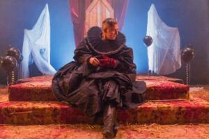 Does anyone doubt that a billionaire’s wife can afford expensive haute couture? No. Only in the documentary Jackie wears casual clothes, and at official events she looks impeccable, thanks not only to the good taste of her designer, but also to her model looks. In the musical, Jackie changes from one bedazzled outfit to another, trading one pair of sparkly high-heeled shoes for another. It seems as if the costume designer [Christian Cowan], inspired by Legally Blonde, deliberately orchestrated this parade of tinsel to demonstrate the character’s lack of taste. The high-quality costumes of the French court, clearly claiming historical accuracy, look striking against this backdrop of cheap luxury. As does the youthful attire of Victoria and her cousin.