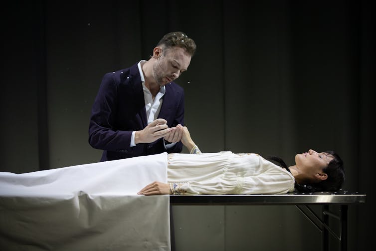 Pirie is at his best when illustrating how in death we’re all reduced to garish cartoons, until we’re made palatable and a version of our best selves again. So too when he’s ripping the white sheets off the corpses, exposing the things we don’t want to see, and laying into the corporatization of grief in Western secular societies — a role undertaken with just the right amount of villainous, clipboard rationale by Chris Baz.
