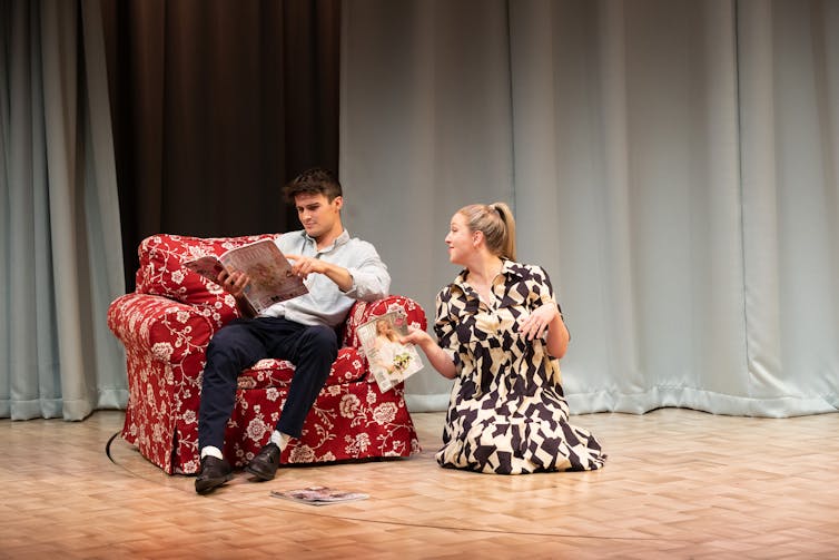 In a meta move, the playwright is also a character on stage watching Bourke playing a younger version of himself — because as he says, we might have wanted a nicer jawline to look at.