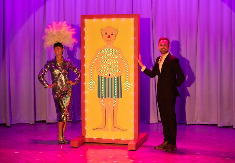The body is represented on stage by a giant model of the board game Operation — all the bits of us flat packed and on display — a huge neon puff erupting when the gases are released — the audience laughing and squirming around in the knowledge of their own barely contained juices.