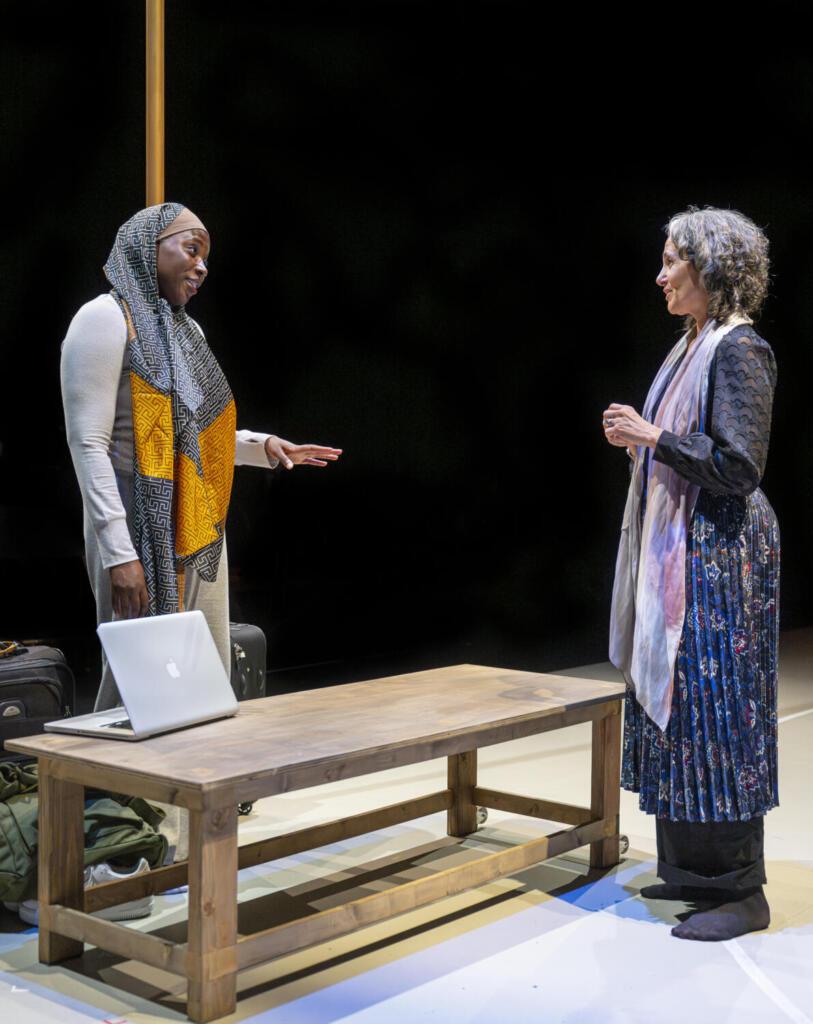 Afghan American immigrant Noor (Nora el Samahy, right) and her best friend Fatima (Jeunée Simon) in the world premiere of Pilgrimage by Humaira Ghilzai and Bridgette Dutta Portman, produced by Golden Thread Productions and Z Space and directed by Michelle Talgarow. Photo by David Allen Studio.