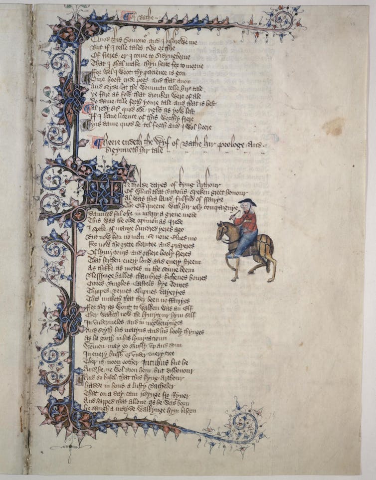 Opening page of The Wife of Bath’s Prologue Tale, from the Ellesmere manuscript of Geoffrey Chaucer’s Canterbury Tales. Photo by Wikimedia Commons.